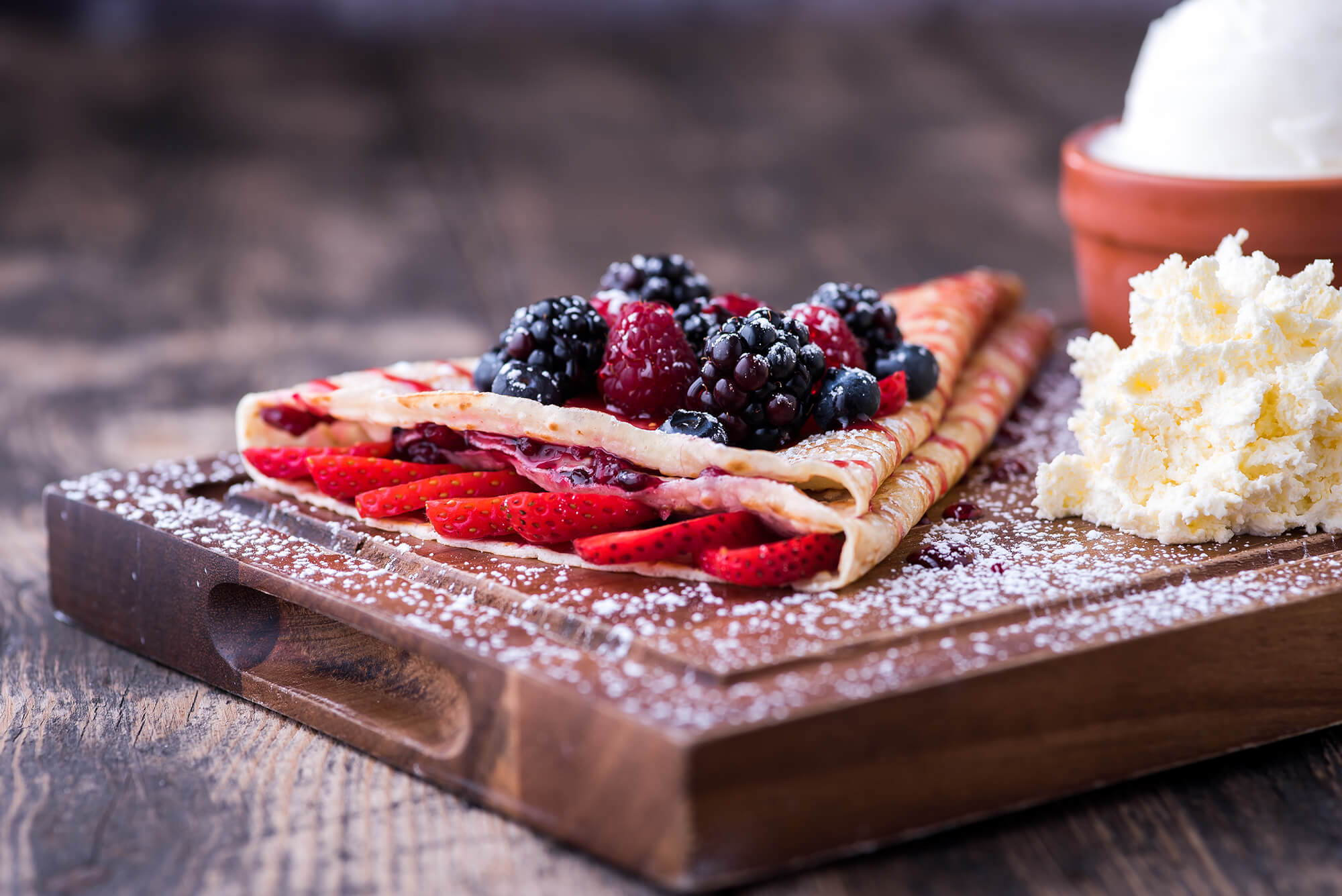 Mixed berry sauce served with a combo of mixed fruit raspberries, blackberries and strawberries.